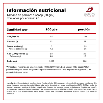 Proteína de caseína micelar de alta calidad, saborizantes naturales y artificiales, edulcorantes (sucralosa, acesulfamo K), emulsionantes (lecitina de soja).
