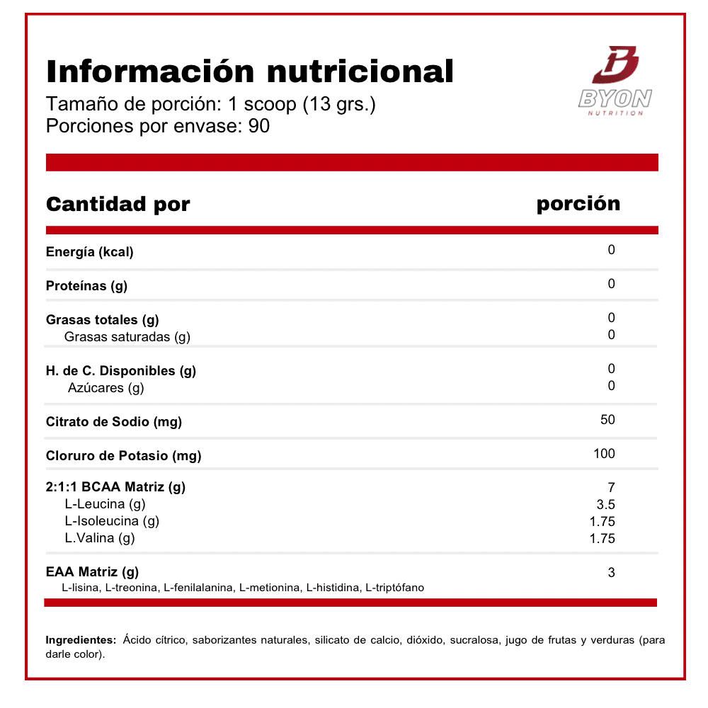 - Ratio Óptimo de BCAA: Contiene una proporción perfecta de aminoacidos: leucina, isoleucina y valina (2:1:1) para una máxima eficacia.