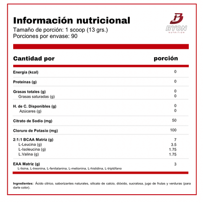 - Aminoácidos de Cadena Ramificada (BCAA): Leucina, isoleucina, valina en una proporción de 2:1:1.